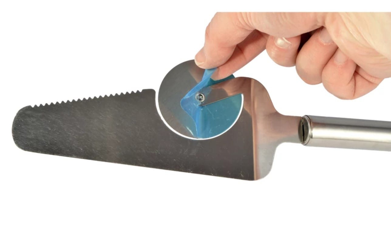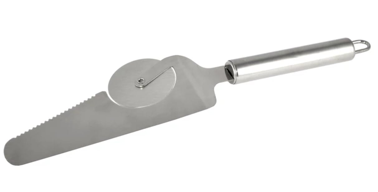 Priročna lopatica z integriranim nožkom za rezanje pizze.