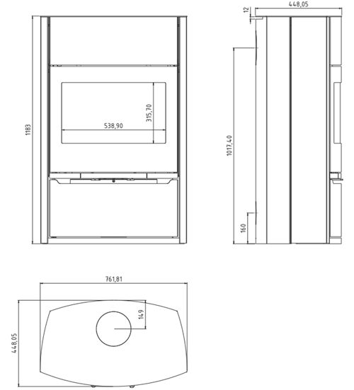 Ročaji, regulatorji primarnega in sekundarnega zraka se ne segrejejo (so iz nerjavečega jekla). Skrita posoda za pepel v notranjosti kamina.