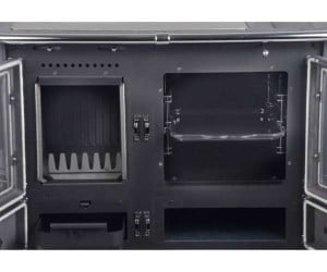 Pod kuriščem in pečico je priročen predal za shranjevanje drv.