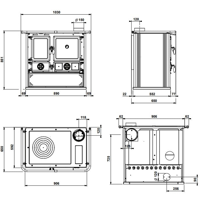 Premer dimnega priključka: 150 mm (možnost priklopa zgoraj ali z zadnje strani desno)