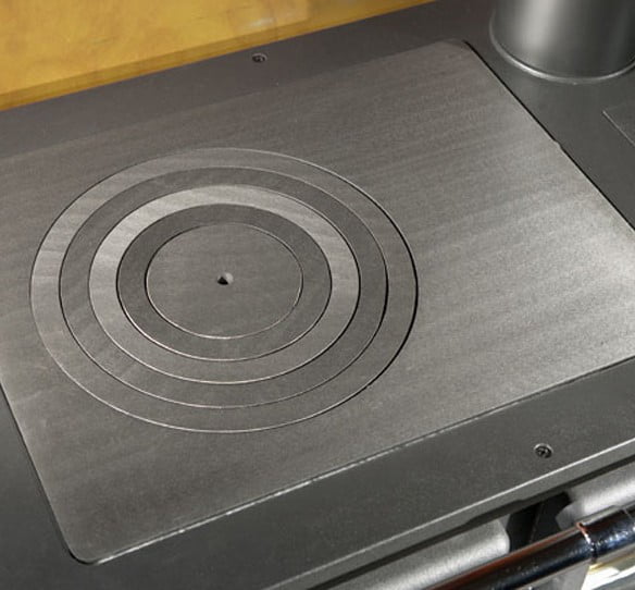 Zunanjost štedilnika Rosetta.16 Maiolica je izdelana iz keramike. Štedilnik ima kurišče v celoti izdelano iz litega železa, pod kuriščem pa je predal za shranjevanje drv. Vratca kurišča so izdelana iz litega železa z oknom iz keramičnega stekla. Kuhalna plošča z obroči in okvir štedilnika so izdelani iz litega železa. Štedilnik vsebuje tudi emajlirano panoramsko pečico s prostornino 28 litrov.