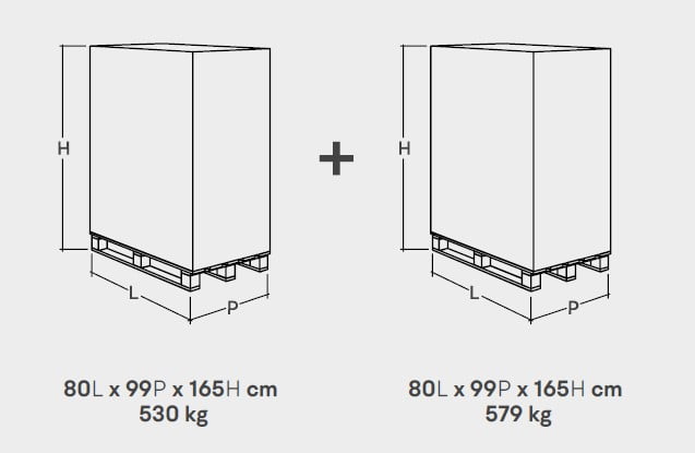 Dimenzije embalaže: 80 cm x 165 cm x 99 cm – 1306800 cm3 – 530 kg; 80 cm x 165 cm x 99 cm – 1306800 cm3 – 579 kg