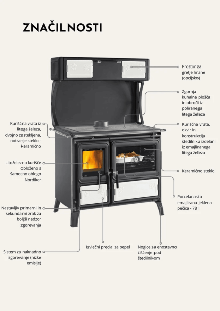 Zunanjost štedilnika GARDENIA XXL CERAMICA je izdelana iz keramike in pločevine. Štedilnik ima kurišče izdelano iz litega železa, vratca kurišča so izdelana iz poliranega litega železa in imajo dvoslojno steklo, pod kuriščem pa je predal za shranjevanje drv. Kuhalna plošča z obroči je izdelana iz poliranega litega železa.Resistant Door at the Time: Vrata peči so izdelana iz visoko kakovostnega litega železa in zagotavljajo popolno tesnjenje v vsakem trenutku.Post-Combustion System: Sistem za naknadno zgorevanje pripomore k manjši količini emisij in tako zadovoljuje visoke Evropske standarde.Clean Glass Control: Sistem, ki preprečuje nalaganje saj in umazanije na steklenem okencu na vratih peči.